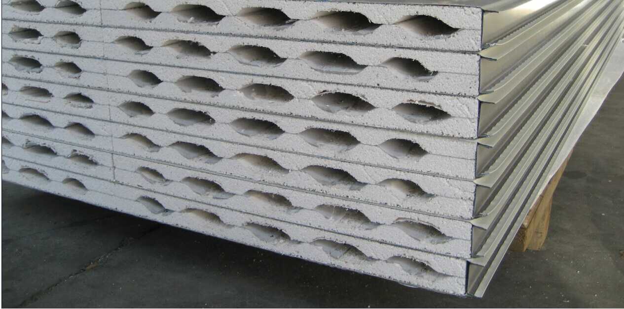 硫氧鎂夾芯板充分發揮了硫氧鎂復合材料的獨特性能,在防火,防潮,防脫膠,高強度,保溫,隔熱,吸音等方面有著顯著地優點及功效。 生產工...